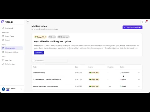 The Meeting Notes section is where all your meeting recordings, transcripts, and summaries are stored in Kitra.